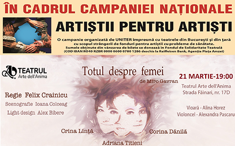 The show “All about women”, by Miro Gavran, directed by Felix Crainicu, was played on March 21’st, 7 PM, in the national campaign Artists for Artists, an event organised by UNITER, at its 18’th edition. The event aims to support artists with health and existential problems. The amount that was raised by selling tickets, the donations and sponsorisations were turned to the account RO40RZBR0000060007801286 at Raiffeisen Back, square Amzei agency, for the Theatrical Solidarity fund. Join the Campaign, buy tickets, enjoy theatre and do a good deed!